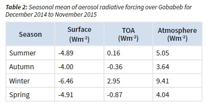 Aerosol radiative forcing is defined as the difference between the downward TOA and the upward (surface) fluxes of the short wave radiation with and without aerosols. This quantity is made available through the AERONET inversion code (calculated in the solar spectrum (0.2 - 4.0 pm)) and the assumptions used in calculating it has been extensively discussed in earlier works (Dubovik and King, 2000; Dubovik et al., 2006; Garcia et al., 2011). Earlier works showed that there is a good correlation between SBDART (Ricchiazzi et al., 1998), a software package usually employed in calculating aerosol radiative forcing and AERONET (Adesina et al., 2014; Alam et al., 2012; Ali et al., 2014). Garcia et al. (2011) further suggested that the value recorded for the surface forcing by AERONET is overestimated and needed to be corrected by (1-SA) where SA is the surface albedo. In this paper, we have employed this method to make a correction to the surface forcing. Table 2 shows the seasonal radiative forcing over Gobabeb. The radiative forcing at the surface ranges from -6.46 Wm-2 in autumn to -4.00 Wm-2 in winter. The TOA ranges from -0.87 Wm-2 in spring to 2.95 Wm-2 winter. The resultant effect on the atmosphere was minimum in autumn with a value of 3.64 Wm-2 and 9.41 Wm-2 in winter being maximum. The resultant is a warming effect throughout all the seasons.