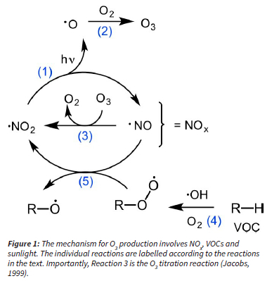 Understanding the termination reactions that remove RO2 and NO2 radicals from this cycle are important in assessing O3 production. In an area with elevated NO2 mixing ratios, NO2 can irreversibly react with OH to form nitric acid, HNO3 (Reaction 6), which is soluble and will be washed out by wet deposition (Figure 1). The other termination pathway occurs in low NOx regions when RO2 (including HO2) radicals self-react to from ROOR (including H2O2) and O2 (Reaction 7) (Figure 1). The latter pathway is negligible in urban areas where considerable NOx mixing ratios are expected. Furthermore, we define the sum of O3 and NO2 as Ox, used as proxy for total oxidants in the atmosphere (Geddes et al., 2009). NOx and VOC emissions can vary considerably depending on location, yet O3 pollution is typically a regional problem due to the transport of precursors from their emission points, further complicating its source apportionment.