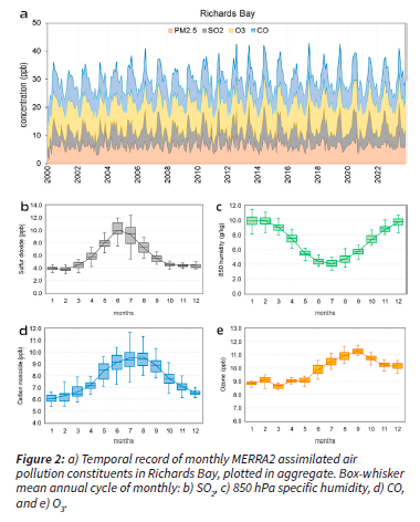 MERRA2 air chemistry data assimilation (Molod et al. 2015, GEOS-5 2016, Gelaro et al. 2017, Randles et al. 2017) provides monthly surface CO, O3, PM2.5 and SO2 concentrations at ~ 50 km resolution from Jan 2000 - Nov 2023. An air pollution index was formed by summing the four values (ppb) at the grid point 28.8°S, 32°E. Daily air constituents NO2 and SO2 derive from OMI satellite (Lamsal et al. 2014) and PM2.5 from MERRA2 at 28.8°S, 32°E in the period Oct 2004 - Nov 2023. Gaps in polar-orbiting satellite coverage were reduced by application of a 3-day running maximum. Hourly PM2.5, PM10, SO2 and meteorology measurements in Richards Bay derive from in-situ stations (Fig 1c) reported to SAAQIS. MODIS satellite infrared and visible band radiance was analyzed for night-time thermal patterns, vegetation fraction and fire locations at 1 km resolution.
