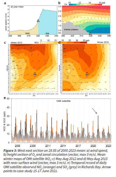 The winter mean maps of OMI satellite NO2 concentrations (Fig 3c,d) reveal a footprint inland from Richard Bay that links westward to agricultural and industrial plumes from the interior. Marine air exhibits low concentrations but seldom penetrates westward during winter due to the prevailing offshore airflow. Local air quality does not exceed long-term health guidelines and is connected to nearby urban hotspots.