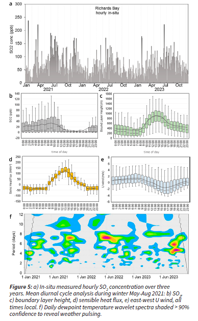 The mean annual cycle of monthly CO, O3, SO2 and 850 hPa humidity was calculated to identify the winter months May-August as most important (Shikwambana & Sivakumar 2019). Statistical pearson-product cross-correlations were calculated between the satellite/model air constituents and independent ERA5 meteorology time series at Richards Bay. The various records cover 288 months (2000-2023), 7000 days (2004-2023), and 2950 hours (May-Aug 2021). Significance at 95% confidence was evaluated according to the degrees of freedom (deflated for persistence). The appropriate thresholds are r > |0.41| monthly, |0.17| daily, and |0.21| hourly. Pulsing of the weather was revealed by application of wavelet spectral analysis to the daily time series of ERA5 dewpoint temperature. Dispersion footprints were mapped using OMI satellite NO2 and MERRA PM2.5 data during the winter. The daily satellite NO2 and SO2 concentration record at Richards Bay was used to identify the winter of 2021 for further study. Maps of satellite NO2 and height sections of CO concentration were calculated and compared with wind observations from Durban airport. The mean diurnal cycle was calculated from hourly in-situ SO2 and weather data, and surface airflow patterns were analyzed by vector averaging May-Aug 2021.