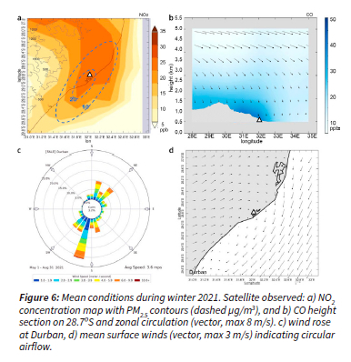 Maps of NO2 and CO concentration over Richards Bay area are presented in Figure 6a,b for May-Aug 2021. NO2 shows a footprint of higher values (30 ppb) over and northeast of Richards Bay. Pollutants from local urban and industrial emissions appear linked to those from the Highveld to the northwest. NO2 is derived from combustion and thus reflects emissions from local traffic, shipping, and agricultural burning. The CO height section identifies local surface emissions that produce the highest concentrations (40 ppb) below 2 km. The zonal circulation is dominated by upper westerlies that subside and weaken toward the surface. CO emissions from Durban infiltrate the Tugela Valley near 31E, according to the winter 2021 'wind rose' in Figure 6c, which shows a 22% frequency from SSW sector. 45% of the time the winter winds are < 3 m/s and non-dispersive. Similar characteristics have been reported at Richards Bay (Petzer et al 2008). One of the most interesting outcomes of this research is the circular nature of net surface airflow (Figure 6d). Winds from the northeast characterize the marine environment, while terrestrial winds are from the southwest. The centre of this rotary circulation is calm and overlies Richards Bay, resulting in little net transport during winter. Although recirculation may be inferred, the ever-present weather pulsing by atmospheric Rossby waves and their attendant high and low pressure cells forces an oscillation of this rotary airflow.