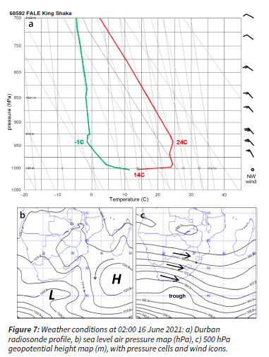 The daily time series of NO2 and SO2 (cf. Fig 3e) identified 15-17 June 2021 with high concentrations representative of a winter air pollution episode. Weather conditions are analyzed beginning with the 02:00 16 June 2021 radiosonde profile at Durban (Figure 7a) 150 km southwest of Richards Bay. The most striking feature was a 10°C nocturnal inversion from 0 - 60 m that decouples momentum transfer resulting in surface winds of 1 m/s. Thermal stability continued to 500 m, but airflow from NW increased to 12 m/s indicative of 'berg' winds. Dewpoint temperatures dropped to -1°C at 500 m due to the subsidence. A lapse rate of -9°C/km above the inversion corresponded with NW winds of 6 m/s. Weather maps at the surface and 500 hPa are illustrated in Figure 7b,c and show a trough to the southwest with a surface low pressure at 40°S, 23°E. A coastal low preceded the trough and was located over the Eastern Cape on 16 June 2021, while the surface Mascarene high was at 34°S, 45°E. The upper westerly jet stream was 40 m/s, consistent with regional forcing seen in Fig 4a.
