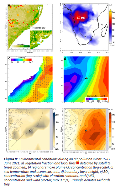 During this air pollution episode, local emissions were joined by smoke plumes from agricultural burning across Africa (Figure 8a,b). Fires over KwaZulu-Natal, the western Zambezi and the Congo Basin were entrained toward Richards Bay causing surface CO concentrations to rise. The boundary layer height was tilted by land-sea contrasts (Figure 8c,d): over the warm ocean current (Agulhas) values were 800 m, while over the cool Tugela Valley, values were 200 m. SO2 and NO2 concentration maps in Figure 8e,f suggest that the prevailing winter land breeze dispersed the Richards Bay emissions seaward.