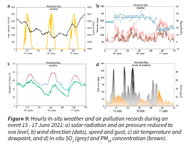 In-situ station data were analyzed from 15-17 June 2021 in Figure 9a-d. Net solar radiation exhibited a diurnal cycle reaching at 500 W/m2 at mid-day with dips from passing clouds. The air pressure of 1019 hPa on the 15th declined to 1011 hPa by the 16th then recovered to 1021 by the 17th, all indicative of passage by a coastal low associated with the mid-latitude trough. Northeasterly winds fluctuated above 10 km/hr on the 15th and 16th then became calm and switched to southwesterly on the 17th. Air temperatures warmed to 24°C each afternoon and declined to 15°C on the evening of the 16th. Dewpoint temperatures might be expected to remain steady but have diurnal cycling, with values of 11°C in the early morning of the 16th and 17th. These indicate 'berg' winds join the nocturnal land breeze and promote radiation cooling during air pollution episodes. Hourly in-situ SO2 and PM10 concentrations revealed spikes above 100 ppb and 20 ug/m3. These were out-of-phase: particulates rose during the day, whereas SO2 rose at night. By the 17th south-westerly winds had dispersed SO2 away from the monitoring stations and toward the city.