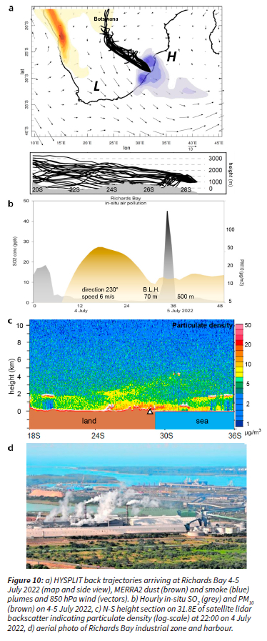 From the Richards Bay SO2 time series an air pollution event 1517 June 2021 was identified for detailed study of local weather using in-situ observations. A radiosonde profile at Durban airport 02:00 16 June 2021 was analyzed for vertical structure of wind, air temperature and dewpoint 1000 - 700 hPa (0-3 km). It is located 150 km southwest of Richards Bay and may be considered representative of KwaZulu-Natal. Regional smoke plumes were analyzed from MERRA2 assimilation 15-17 June 2021, and satellite fire density (FIRMS 2023) and vegetation fraction were analyzed. Lastly, a particulate event was analyzed for 4-5 July 2022. Local measurements and a north-south height section of CALIPSO satellite particulates (Winkler et al. 2007) were analyzed. HYSPLIT back-trajectories were calculated (Stein et al. 2015) to identify long-range transport of dust and smoke plumes from distant sources and local hourly weather data were obtained on wind speed and direction, sensible heat flux and boundary layer height.