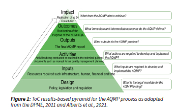 This is then presented in the form of a causal narrative and visual ToC map (Figure 2). The South African AQMP development and implementation system is broken down into six different ToC components (i.e. design, inputs, activities, outputs, outcomes (immediate and intermediate), and impacts following the ToC approach of other key studies (Alberts et al., 2022; Moolman et al., 2022; Alberts et al., 2022; Thorton et al., 2017; DPME 2011; Weiss, 1995; Stein, and Valters, 2012; Romero, and Putz, 2018). These ToC evaluation components are generally conceptualised and designed based on the so-called results-based pyramid (Alberts et al., 2022; Moolman et al., 2022; Alberts et al., 2021; DPME, 2011).