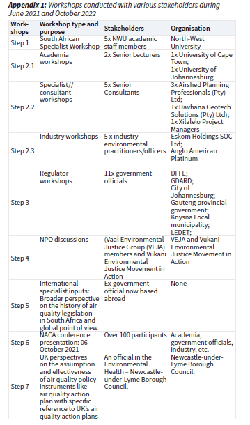 Step 4: General stakeholder discussions: These engagements were conducted following the input from the previous workshops. Participants in these discussions included three members of non-profit organisations (i.e., Vaal Environmental Justice Group (VEJA) and Vukani Environmental Justice Movement in Action). These organisations are active and influential environmental justice organisations in the Vaal Triangle Airshed Priority Area (VATAPA) and Highveld Prioty Areas (HPA) which are among the air quality priority areas in South Africa.