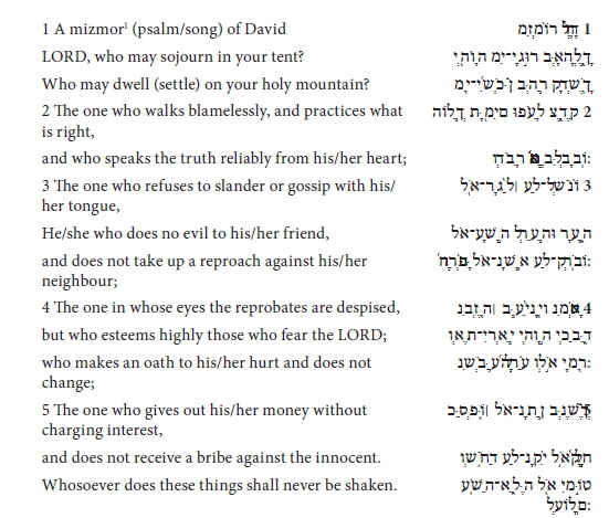 [who?] indicates that the question being asked is about issues of identity. The identity issues reaches back to Psalm 1 where the faithful are described as those who follow not the counsel of the wicked but Yahweh's Torah. The response in verses 2-5a focuses on general descriptions, followed by specific actions and attitudes, reminiscent of Yahweh's Torah (Kessler 2013:400; Brueggemann & Bellinger 2014:83).