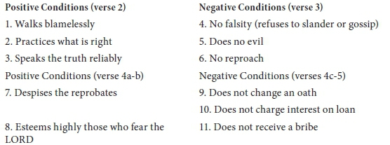 The responses provided by to the questions are mostly stated in the negative. In verse 2, the psalm employs participial verb forms, denoting customary or habitual lifestyle, to articulate a response. The psalm presents 10 entrance conditions which have been considered as part of the Decalogue tradition in the Pentateuch (Davidson 1988:56; Knight 2001:70-71; Brueggemann & Bellinger 2014:82). However, an 11 fold structure can be noticed in light of the three conditions presented in verse 4. Craigie's (2004:150-151) 10 structural portrayals of the moral conditions of the faithful that comply with Yahweh's Torah, in addition with the 11th observable condition and some other modifications are shown below: