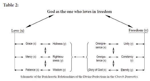 I suggest that Barth's (1957:322ff) schema of the perfections9 of God is the ideal starting point for this rediscovery of grace. As Holmes (2008:206) comments about it, "If the doctrine (of God) is to perform the salutary theological work for which it is capable, it would be to its advantage to describe as does Barth, God's attributes in terms of a series of short-hand descriptions which agree with God's enacted identity...". Titus (2010:212) represents Barth's schema of the perfections of God as the dyadic system presented below in table 2: