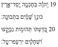 The text denotes the common idea of the time in which the earth was conceived as a mass resting on an ocean (Ps 24:2; 136:6), and as having foundations and supported by pillars beneath the ocean (in Sheol) (Is 51:33; Job 9:6; Am 9:2-3).5 Likewise, above the earth, the sky (שָ) was thought of as a solid barrier (ׇ ר) fixed in its place by God (Gen 1:6; Is 20:22) and held by pillars (Job 26:11) so that the water-above should not descend towards the water-below and turn creation into chaos.6 This renders the Hebrew concept בְחכָמְהָ as "into Wisdom" implying a quality of "order" immanent in creation (v. 19) or even a quality of intrinsic value embedded into the created order.