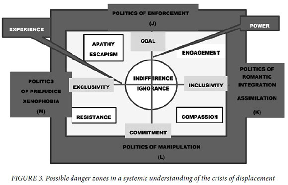 One must consider different possible danger zones (J, K, L, M) (figure 3) as well. The function of the chart is to reveal the complexity of the phenomenon of displacement. The fact is, life is never straightforward. Goal setting and values contribute to motivation and possible action. But at the same time, goal setting and decision-making can easily develop into the power play of enforcement and violent oppression (J). Inclusive re-connection runs the danger of an underestimation of cultural complexities.