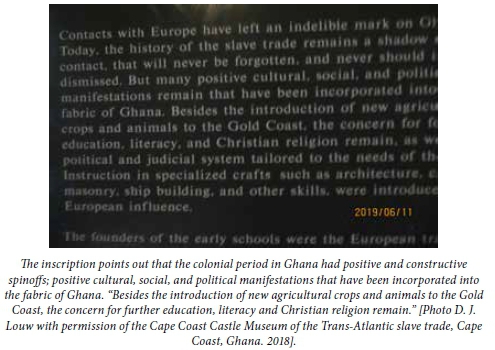 Very surprisingly, at the southern coast of Ghana at the castle where the slaves with captured in dungeons before they were shipped to the Americas and sold like animals on a street market, I found the following remarkable inscription in the little museum at Cape Coast about both the disadvantages and advantages of the colonial period.