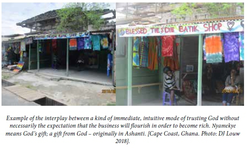 In an interview with people living in Accra,4 I was told that these Christian slogans should not be interpreted as a kind of syncretistic manipulation of God. In general (there are indeed exceptions), the presupposition in informal spaza spirituality is that faith is an integral part of daily living; trusting God is a mode of life and a vital ingredient of the struggle to survive. With the "fortogenetics of spaza faith" is meant a piety that renders life as a gift of God (Nyamekye).5Faith enables one to cope with the demands of life because the basic premise is: God is good (Ashanti slogan).