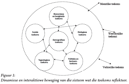 Dit is uit hierdie figuur duidelik dat die toekoms as 'n dinamiese sisteem voorgestel kan word. Deurdat elemente binne die sisteem aanmekaar verbind is en met trek- en stootkragte mekaar beïnvloed, word dit interaktief deur pyle voorgestel. In die dinamika van die sisteem lê die toekoms. Die opsies van 'n moontlike toekoms, asook waarskynlike en verkieslike toekomste lê hierin opgesluit. Met verloop van tyd verander hierdie uitkomste van die toekoms.
