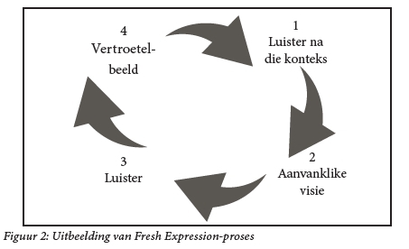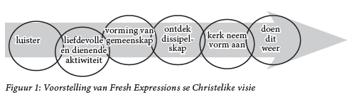 Figuur 1 hieronder definieer Christelike visie soos gesien deur die oorspronklike Britse Fresh Expression-beweging (Fresh Expressions 2015:7d). Hierdie proses is spiraalvormig en sal waarskynlik 'n paar keer herhaal word. Figuur 2 vind vervolgens noue aansluiting by Figuur 1. Dit alles word meer breedvoerig onder Figuur 2 bespreek.