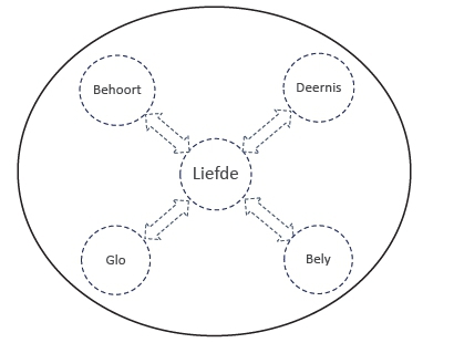 Figuur 4: Liefde bly sentraal en is verbind aan al die ander elemente. Deernis en sagte verhoudinge kom as element by. Die tradisionele elemente van eers bely (na verskeie jare se kategese), dan glo nadat 'n persoon genoeg kennis het en dan uiteindelik mag behoort is almal aanwesig, maar funksioneer nie meer so sterk modernisties en voorwaardelik nie. Die stippellyne toon die dinamika aan wat nader aan en verder weg van mekaar kan skuif. Dit kan ook in die toekoms sekere nuwe elemente insluit.