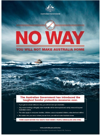 While there is a rich scholarship analysing Australia through the critical lens of terra nullius and the ongoing racist theft of land, there is much to be gained from analysing Australia's relationship with the sea. Renisa Mawani has encouraged scholars to consider "how oceans may reorient studies of law and settler colonialism by expanding the sites and surfaces of colonial legal power" (Mawani 2016: 109). According to Australia's current Migration Act, people who arrive irregularly by boat are referred to as "unauthorised maritime arrivals" (formerly "offshore entry persons"). Created as a legal category in 2013, being an "unauthorised maritime arrival" means being subject to forced transfer by the Australian government to one of its "offshore processing centres" on Manus Island, Papua New Guinea, or Nauru (Migration Act 1958: Ss5AA). The Australian government uses posters featuring a small boat in a menacing sea to deter irregular migrants from attempting to reach Australia by boat. This outward-facing government messaging is mirrored by incessant domestic messaging from both major Australian political parties that they can be trusted to "stop the boats" (Fleay et al. 2016).