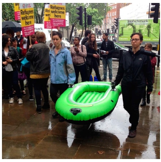 On June 20 2016, UN World Refugee Day, two women carried a rubber boat into Australia House. The two women approached the Australia House traffic island flanked by a large group of supporters. On reaching the building's main entrance, clasping the boat on either side, they opened the doors and entered the foyer. There they were met by security. Supporters flocked in behind the boat, spontaneously occupying the foyer. Demanding that the boat be granted entry and that Australia end its regime of offshore detention, the activists and supporters remained in occupation of the Australia House foyer until security called in armed police.