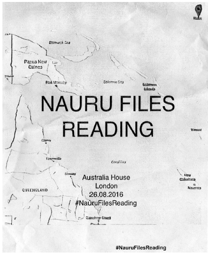 In late August 2016, activists carried out a durational performance involving the reading of the Nauru files, a database of more than 2 000 incident reports leaked from the Australian refugee detention centre on Nauru.7 The performance took place directly in front of the main entrance to Australia House, and has since been mirrored in several cities across Australia (see Loves Makes a Way 2016). A group of seven women transcribed the Nauru files, while more than 30 anti-racist activists partici pated in the reading. Many more attended the performance, which lasted into the night and for more than 10 hours, providing support and sustenance. A crowd consisting of both passers-by and supporters who had heard about the event on social media gathered to listen to the incident reports. Taking their seats on the pavement, this area in front of Australia House was temporarily turned into a theatre, with readers creating a live memorial to the ongoing abuse and daily suffering of those detained on Nauru. More than 300 programmes which gave a brief description of the performance and explained the 'cast' of key players were distributed in the course of the performance.