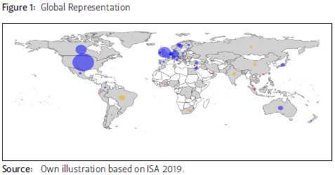The Annual ISA Convention in Toronto in 2019 serves as an empirical basis for analysis here. Held between 27 and 30 March 2019, in total 5 664 academics participated in 1 180 panels and roundtables. With more than 6 500 members (representing more than 100 countries), the ISA can be considered, as pointed out on the ISA website, as the "most respected and widely known scholarly association" in the field of IR (ISA 2022). Its annual conferences are among the largest international gatherings of IR scholars from all over the world which renders an in-depth examination of its composition all the more relevant. As the last non-virtual, pre-pandemic conference held under the roof of the ISA, the 2019 Convention in Toronto therefore constitutes an insightful set of data in order to analyse the representation of scholars at one of the 'flagship meetings' in the field.