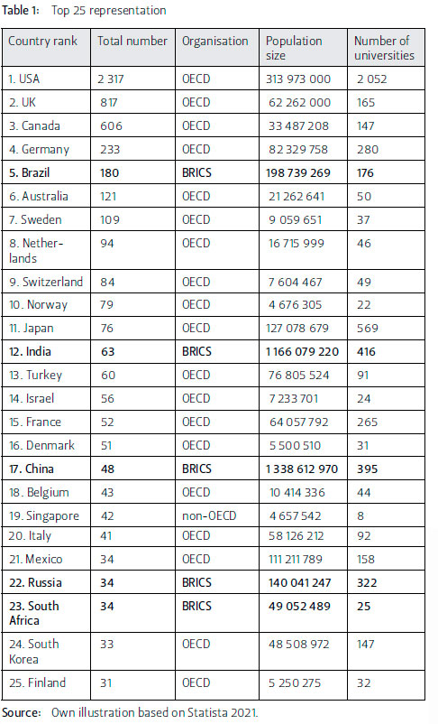 In line with Mignolo's notion of "geopolitics of knowledge" (2002), scholars such as Grovogui (2006) or Sajed (Hobson and Sajed 2017) present alternative definitions of the Global South, thereby encompassing marginalised communities (of people of colour, women, and migrants) in Western societies. Applying that intersectionality perspective to the analysis would mean to include the representation of predominantly marginalised institutions in the discipline (e.g. historically black colleges and universities (HBCUs)). Also, using BRICS as a category is worth criticising for its hegemonic nature vis-ä-vis the outer groups. Taking R&D indicators as criteria for deeper analysis instead would certainly reveal that countries such as South Korea, Singapore, or Israel fare better than many countries listed in the OECD sample (e.g. UK, Canada, Australia). However, regardless of that justifiable critique against the simplified categorisation used in this article, neither a more refined Global South analysis nor a specific look into R&D or other indicators would change the overall results presented above. While one could easily think of different analytical distinctions (e.g. G7, NATO, EU), the OECD/non-OECD/BRICS framework, however, remains the most insightful for analysis. This is because of the multifactorial nature of the OECD as an international organisation. In general, OECD member states can be characterised as powerful and relatively dominant in comparison with their non-OECD counterparts - not only regarding economic criteria but also considering political, geostrategic, cultural, symbolic, and academic manifestations. Selecting BRICS as a semi-peripheral category is based on the assumption that universities in Brazil, Russia, India, China and South Africa would be the most capable of closing the knowledge representation gap with OECD countries.