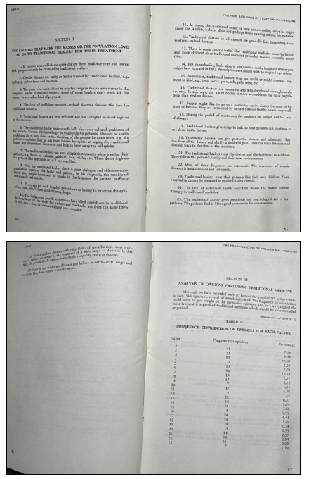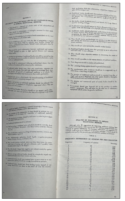 In 1979 Cameroon was almost 20 years into its independence from France and Britain. ABBIA: Cameroon Cultural Review was first published in 1963, barely a couple of years into the country's independence. In June 1979, 14 years following its foundation, the review published a seminal study by Daniel Noni Lantum, titled "The Pros and Cons of Traditional Medicine in Cameroon" 4. No person was better placed than Lantum to tackle the subject matter at the time, given his credentials as Professor of Community Health, Head of Department of Health Education and Behavioural Sciences, Coordinator of the Public Health Unit at the Faculty of Health Sciences at the University of Yaounde, WHO consultant on Traditional Medicine, and traditional chieftain from the Nso ethnic group in north west Cameroon. He was truly a deeply informed and experienced straddler of the competing, complementary and often conflictual medical systems in post-independence Cameroon. The article, initially put together as a booklet on traditional medicine in Cameroon, was based on a survey of 120 medical and health technician students at the University Centre for Health Sciences of Yaounde University. The students - who would graduate and practise medicine in a Cameroonian context in which both the colonial medical system inspired by German, French and English traditions in conversation with science and the Indigenous/endogenous medical system co-existed - were asked to respond to two questions: "Why do many of our people, when sick, prefer to be treated by traditional medicine-men?", and "What do you consider to be desirable changes in the system of traditional medicine as currently practised in our communities".5