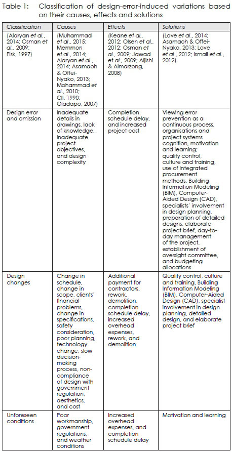 Osman et al (2009: 143) and Muhammad et al. (2015: 92) classified variation, according to their causes, as design errors and omission (65%), design changes (30%), and unforeseen conditions (5%). Fisk (1997) stated that the two basic types of variation are direct and constructive changes. Direct changes occur when a client instructs the contractor to perform works that are not specified in the contract document or makes additions to the original scope of work. Constructive changes are informal acts or modifications to a contract, due to an act or failure to act. Juszczyk, Kozik, Lesniak, Plebankiewicz & Zima (2014: 285) analysed the errors committed in design and classified them based on error group, person responsible for the error, and place of error in designs.