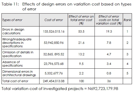Errors in design calculations (53.5%) had the highest effect on total cost of errors. This was followed by wrong/inadequate description in specifications (21.6%), omission of details in specifications (13.2%), absence of specifications (9.5%), and dimensional error in architectural drawings (2.2%), respectively.