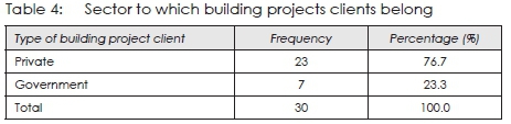 The number of building projects with contract sums above N500 million Naira were 16.7%; 33.3% of the projects cost between N100 million and N500 million Naira, and 50% were below N100 million Naira. It is worth noting that all (100%) the projects investigated were multi-storey buildings.
