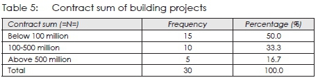 Table 5 shows the different contract sums under which the building projects are categorized.