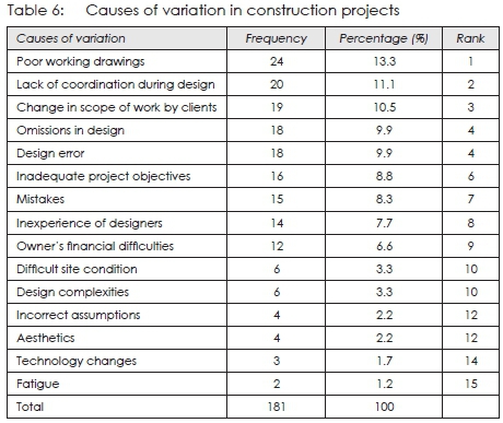 Table 6 indicates the result of the interviews conducted with professionals on the causes of variation in construction projects. Once the contents of the interview results were analysed, 15 causes of variation were identified and tabulated as shown. The frequency represents the number of respondents who mentioned the identified causes, and the percentage represents the fraction of the individual frequency to the total frequency of occurrence of the variation. It is important to mention that some of the causes identified by the respondents may be taken as design errors, on the one hand, and they may, however, equally be regarded as causes of variation, on the other.