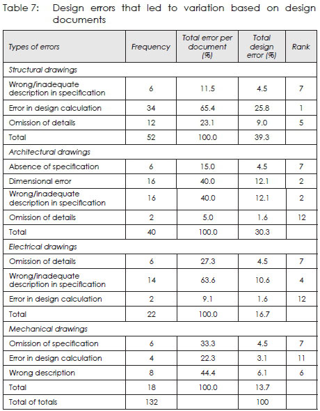 Poor working drawing (13.3%) was the most rated cause of variation on construction projects, followed by lack of coordination during design (11.1%), change in scope of work by clients (10.5%), design errors (9.9%), omissions in design (9.9%), inadequate project objectives (8.8%), mistakes (8.3%), inexperience of designers (7.7%), owner's financial difficulties (6.6%), design complexities (3.3%), difficult site conditions (3.3%), aesthetics (2.2%), incorrect assumptions (2.2%), technology changes (1.7%), and fatigue (1.2%), respectively. Many of the causes of variation identified in the study were more design related; this is consistent with the claims made in the literature reviewed in this study. To elaborate on this finding, a breakdown of valuation/variation documents from the construction buildings of this study was done to examine specific design errors that led to variation in construction projects (see Table 7). It was also important to examine the frequency of occurrence of design errors according to the types of errors identified (see Table 8) and to describe the design errors that led to variation on building projects (see Table 9).