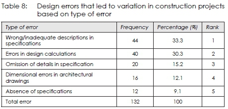 Table 8 also indicates that specification-related errors accounted for 57.6% of the total errors leading to variation in construction projects. This implies that many problems are yet to be solved in the specifications of construction drawings. These problems include provision of clear and detailed specifications for materials, and correct and adequate description of specification, among others. In addition, errors in design calculations constituted 30.3% of the total errors leading to variation in construction documents. In Nigeria, at present, many civil/structural engineers do not use Computer-Aided Designs (CAD) software for their designs; yet they mostly do not carry out manual calculations before providing for numbers and sizes of reinforcement required as main and distribution reinforcement bars of construction projects. They only rely on residual knowledge of seemingly similar projects that have been designed at some point.