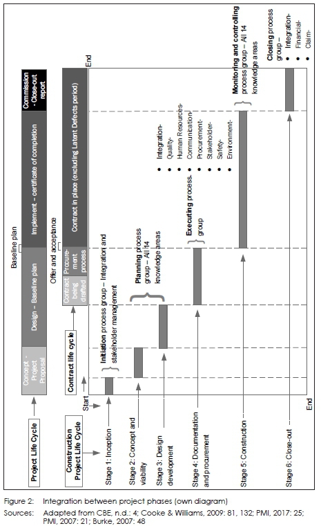 Figure 2 illustrates the construction project life cycle, as described by the CBE on the left with the contract life cycle at the top (stages 1 to 6). The Project Management Processes and the applicable knowledge areas are illustrated adjacent the PLC stages and subsequently linked to the CPM life cycle (PMI, 2017: 25; PMI, 2007: 21). Taking this into account, the South African Council for the Construction Profession defined the six stages of the PLC (South Africa, 2011: 4-10).