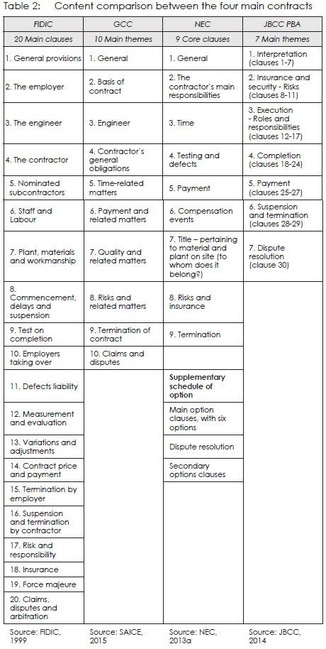 In order to find a relationship between construction contracts and construction project management, the general structure of these main contracts was analysed and tabulated under the categories of main themes and clauses. Table 2 introduces the main themes and clauses.