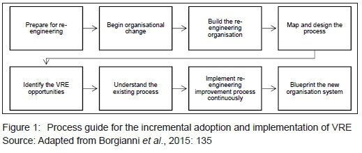 A review of literature revealed five key adoption phases of the VRE implementation process, namely preparing for re-engineering; mapping and analysing process; designing the process; implementing the re-engineered process, and improving continuously (Emerie-Kassahun & Molla, 2013: 575).