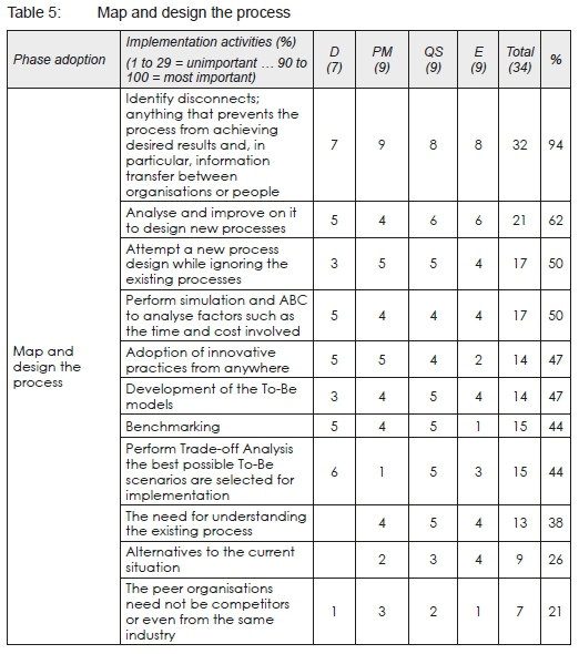 The map and design of the process consists of 11 implementation activities (see Table 5). With a 94% rating, interviewees perceived identifying disconnects, which prevent the process from achieving desired results, as the most important activity in adopting and implementing VRE. Analysing and improving new processes design (62%) is in line with Eke and Adaku (2014: 114). Interviewees perceived attempting a new process design, while ignoring the existing processes, and performing simulation and analysing factors such as the time and cost involved, as fairly important in mapping and designing the process to be re-engineered. Madane and Joshi (2018: 1843) believe that less important or unimportant activities in the process of mapping and designing the process are innovative practices that can be adopted from anywhere, developing the To-Be models, benchmarking, performing trade-off analysis the best possible To-Be scenarios, understanding the existing process, alternatives to the current situation and the peer organisations need not be competitors are vital in mapping and designing the process for phase adoption of VRE.