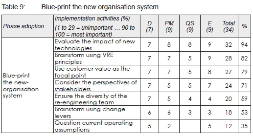 Table 9 shows the rating results for the seven implementation activities during the stage of blue-printing the new organisation of VRE adoption and implementation. With a 94% score, impact evaluation of new technologies is rated the most important activity considered in blue-printing the new organisational system. These findings agree with those of Omidi and Khoshtinat (2016: 426). Dachyar and Sanjiwo (2018: 8) opine that brainstorming using VRE principles (82%); using customer value as the focal point (79%), and considering the perspectives of stakeholders (71%) were important activities in VRE incremental adoption and implementation for blue-printing the new organisational system. In line with Madane and Joshi (2018: 1843), interviewees perceived less important activities in VRE adoption and implementation for blue-printing the new organisation as ensuring the diversity of the re-engineering team; brainstorm using change levers, and questioning the current operating assumptions.