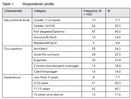 In 2020, according to the Construction Industry Development Board (CIDB), 260 individuals were working in construction-related occupations registered within the Polokwane Municipality, South Africa. Purposive sampling (Creswell, 2014: 50) was used to select 160 individuals from this population as participants in this study. The sample size for research done among construction-related populations was calculated in accordance with the table recommended by Krejcie and Morgan (1970: 608). From the table, the recommended sample size for a population of 260 is 155. This resulted in a sample size of 61%. This recommendation validates the sample size of 160 as efficient for the population of 260. From the sample of 160, 103 participants completed and returned the survey responses, resulting in a response rate of 64%. According to Moyo and Crafford (2010: 68), contemporary built-environment survey response rates range between 7% and 40%, in general.