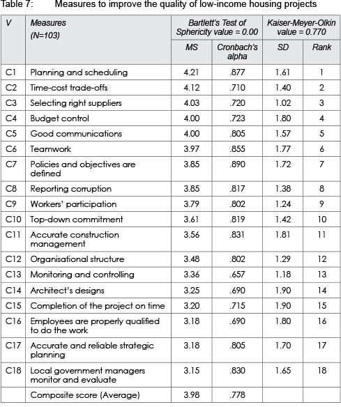 Table 7 shows an average MS of 3.98. The respondents ranked as important the factors that could be considered to minimise non-conformance to quality of low-income housing projects. The Cronbach's alpha was greater than 0.70 at .778, indicating acceptable internal reliability, as recommended by Taber (2018: 1279).
