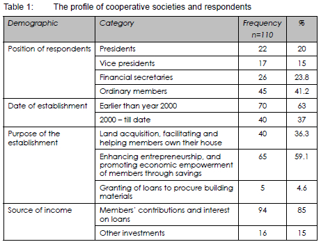 A list of 1055 cooperative societies in the city, obtained from the Ministry of Trade and Cooperative Investment in Osogbo, forms the population for the study. The 1055 identified societies were stratified between the two local governments in Osogbo, the capital city of Osun State, based on their business addresses across Olorunda and Osogbo local government areas. Osogbo Local Government area had 825 registered cooperative societies, while there were 230 in the Olorunda Local Government area. However, during a reconnaissance survey, many of them were not found at their stated addresses; this may have been due to relocation, or discontinuity in their operations, or inconsistencies in documentation. Thus, a total of 437 cooperative societies were physically identified at their addresses. From this list, purposive sampling technique (Creswell, 2014: 50) was adopted to select 180 registered societies; one respondent from each society was selected for questionnaire administration. Of this number, 152 were returned, but only 110 were correctly filled in and valid for the purpose of this study; this represented a response rate of 61%. Although the sample size is not valid and not within the recommended sample size of 205 for a population equal to or above 440 (Krejcie & Morgan, 1970: 608), these 437 cooperative societies with traceable physical addresses, substantiate the size of the sample.