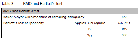 The need to ascertain the extent of adequacy of the data loaded for the study informed the use of Kaiser-Meyer-Olkin (KMO) and Bartlett's test. The KMO value obtained (see Table 3) was 0.865, which was higher than the minimum recommended value of 0.500 (Shrestha & Luo, 2017: 12).