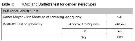 Ten items of the gender stereotypes construct with communalities loadings of 0.4 and above were subjected to EFA. The KMO for gender stereotypes was 0.931, which is greater than 0.70, and a significant Bartlett's test of Sphericity with p<0.000 was obtained, as shown in Table 4. The results meet the criteria for factor analysability.