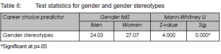 The Mann-Whitney U test was conducted to test for significant differences between men and women, with regards to the influence of gender stereotypes. Table 8 shows the mean scores for the career choice predictor, and the rank order for men and women.