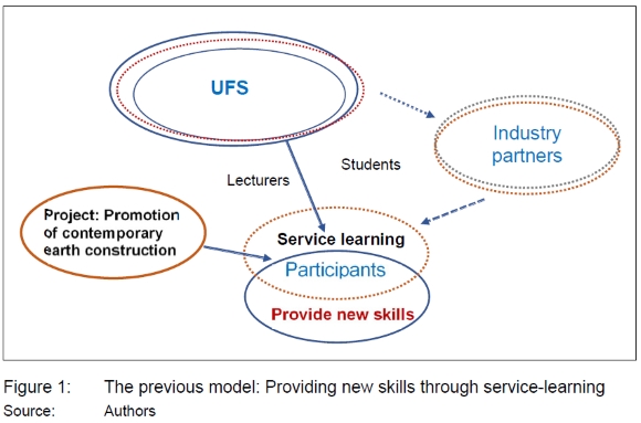 The Department of Architecture at the University of the Free State (UFS) used a model in past community development engagement (see Figure 1). The Department of Architecture has used this model since 1996 to support new skills for participants and students through service-learning.