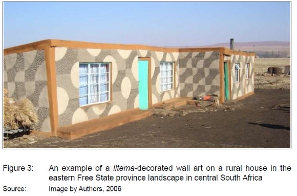 Various studies extensively recorded the contribution of South Sotho women in designing and preserving domestic areas in rural regions of the eastern Free State and Lesotho (Casalis, 1861; Tyrrel, 1971; Knuffel, 1973; Motsepe, 1999). The earliest evidence of this tradition was recorded in 1812 (Campbell, 1815). These records illustrate that decorative art was and still is central to the role and significance of women in the rural built environment. The importance, meaning, and methods used in the creation of litema (pronounced: di-te-ma) have been explored in a few studies by scholars (Gay, 1980; Van Wyk, 1998) and reflections from a photographer (Changuion, 1989) in the late 20th century. South African architect and academic Franco Frescura (1985) made substantial contributions to the practices of decorative wall art of South African cultural groups such as the South Ndebele and the Vendas linked to a socio-cultural order and representation.