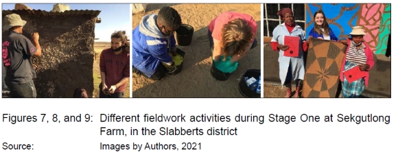 The three different field trips had the same programme. Forty-two students were divided into three groups to spend three days participating in various activities of the fieldwork assignment. Activities included supervised tasks, gathering raw materials, surveying existing homes, and preparing surfaces for movable plaster panels, forming part of the exhibition. On arrival, a short introductory meeting presented the aim of the fieldwork activities to artists and participants. The introduction highlighted how the fieldwork is an active effort to build sustainable relationonships between the UFS and artists. During the fieldwork when participants could not understand each other's languages, they communicated through body language and facial expressions. The applied model of fieldwork method is well-developed in anthropology, but seldom used in architecture for teaching and learning. Social interactions between participants spontaneously developed over the three days. The focus was on a shared expehence, in which 36 women and six men were asked to teach the art of tradicional South Sotho litema wall decoration to 42 second-year architecture students (Figure 7-9).