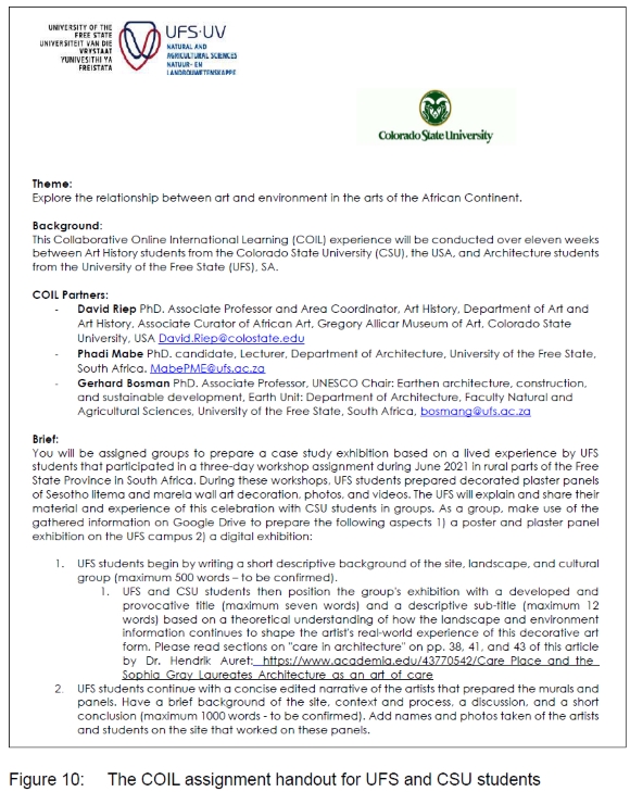The research team joined their outcomes with David Riep from the Colorado State University (SCU) through a COIL exchange to contribute to the gap in more recent literature on litema perceptions. Riep's (2011, 2014) experience and knowledge of litema symbolism, cultural connections to heritage, ancestral connections, and South Sotho rites of passage make him an appropriate partner for this COIL experience. The COIL activity aimed to foster a sense of international solidarity among students from different parts of the world through an integrated educational experience. The students were allowed to develop their intercultural awareness and collaborative skills. Students had to complete an assignment (Figure 10) that resulted in a poster series for an exhibition.